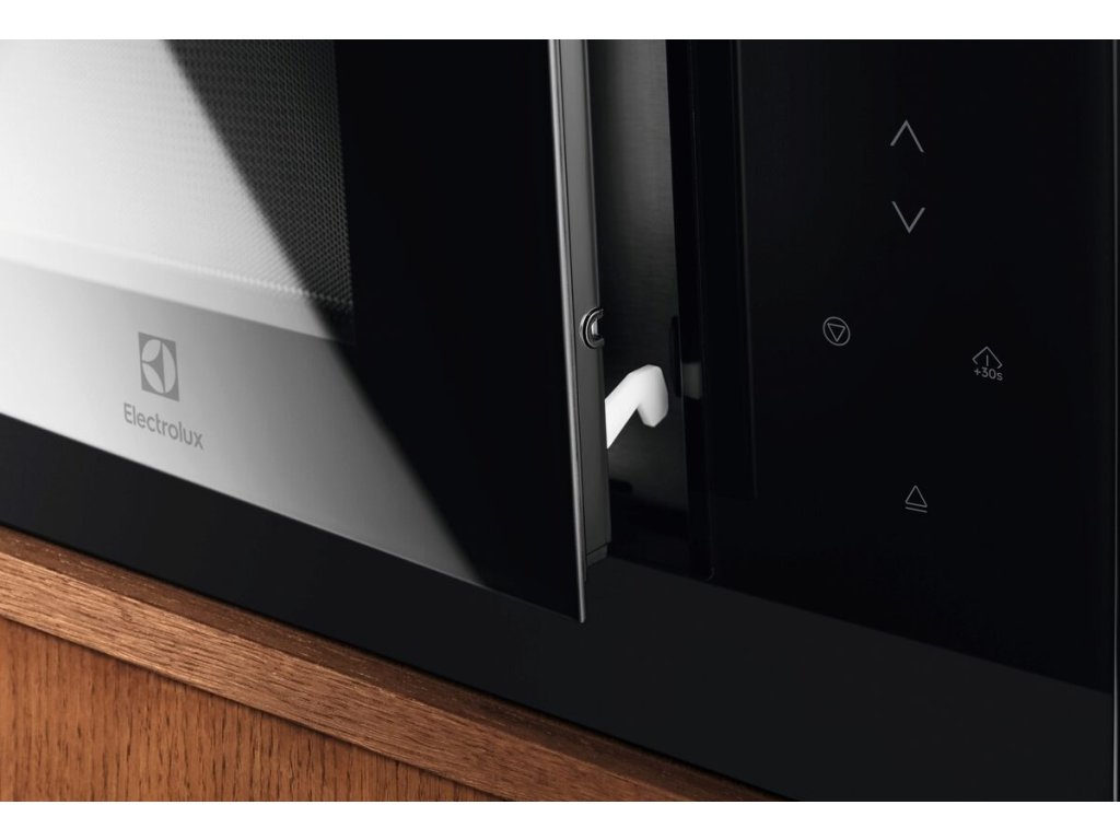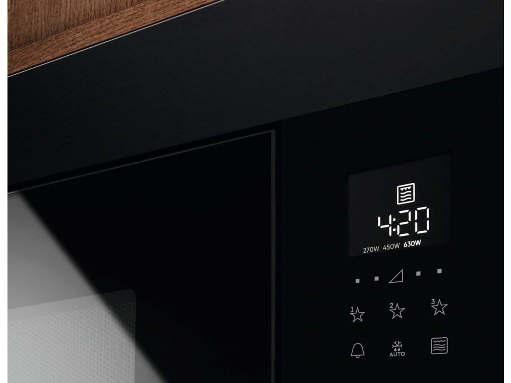 Prémiový matně černý povrch dvířek mikrovlnné trouby kontrastuje s prvky v černém lesku. Designově tak ladí s ostatními spotřebiči v kuchyni.