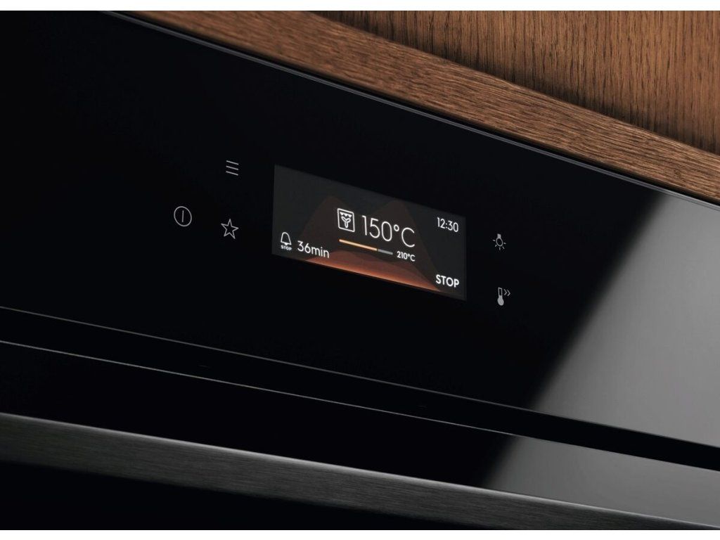 Elektronické funkce: Function lock (in running mode), tóny kláves, alarmů a chyb, aktivace/deaktivace (kromě hlavního vypínače), hlavní vypínač, denní paměť 3 dny zpětně, minutka, Oven light on/off selectable (menu direct access button), ukazatel teploty (°C), ukazatel zbytkového tepla, použití zbytkového tepla, info k servisu, vypnutí denního času při vypnuté troubě, doporučená teplota, denní čas, jídelní sonda - indikace teploty jádra, Food sensor end action adjustable, jídelní sonda s odhadem času, elektronická regulace teploty, elektronický zámek dveří, Electronical door switch, výběr rychlého předehřátí, jídelní sonda, automatické vypnutí jídelní sondy, 169 Variety of pre-set cooking programmes 'Assist', 3 oblíbené programy, 3 pyrolytické cykly (rychlý, normální, intenzivní), nastavení hlasitosti minutky, Prověření výsledku/Prodloužení času (Finish Assist podle zbývajících 10 % doby trvání), Dětský zámek, minutka pro čištění, Standby verze, čas vaření, čas vaření s odhadem konce, přičítání času, Odložený start, 31 Languages/Text display, akustický signál, automatické vypnutí (jen trouby), demo program s kódem, nastavení jasu disp., TFT plnobarevný dislplej s dotykovým ovládáním