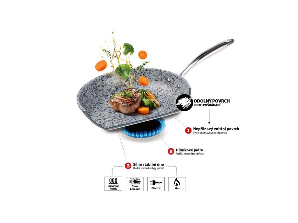 Pánev opatřena vnitřním povrchem odolným proti oděru a připalování, silným dnem a velmi elegantní nerezovou rukojetí