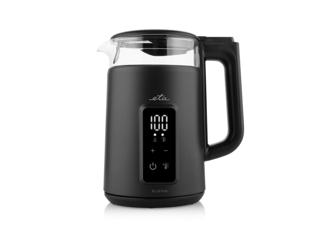 Skleněná rychlovarná konvice ETA Elena ve dvouplášťovém provedení bude nejen praktickým, ale i stylovým doplňkem každé moderní kuchyně. Na přehledném LED displeji pohodlně sledujete aktuální teplotu vody, zatímco pomocí intuitivních dotykových tlačítek si jednoduše zvolíte přesně takovou teplotu, jakou právě potřebujete – od 40 do 100 °C.
