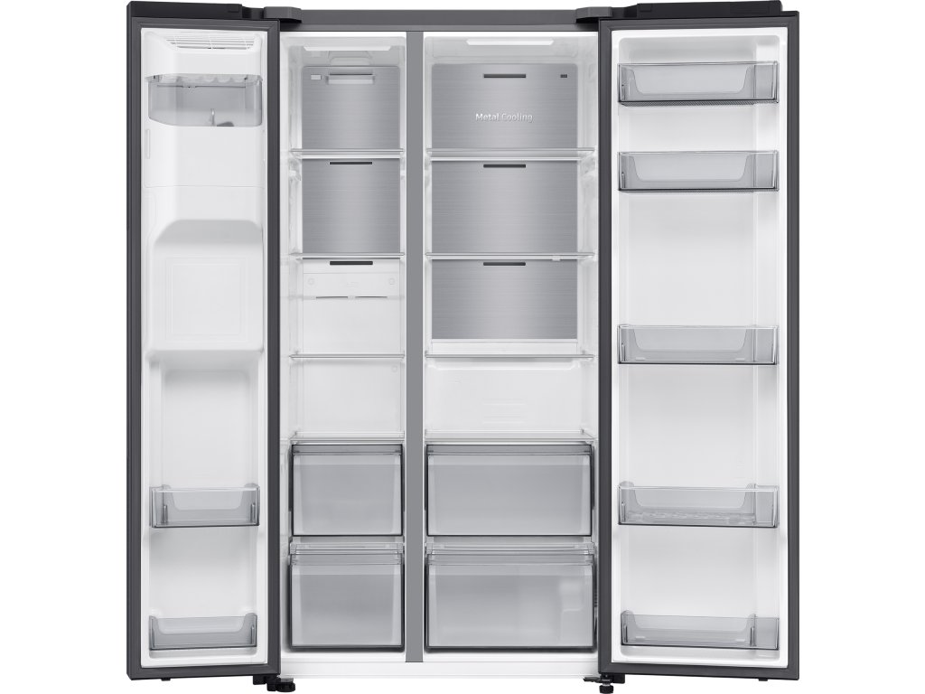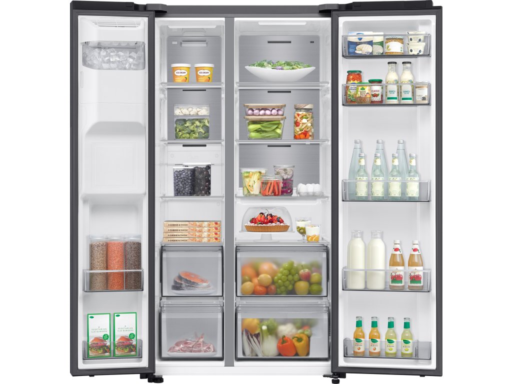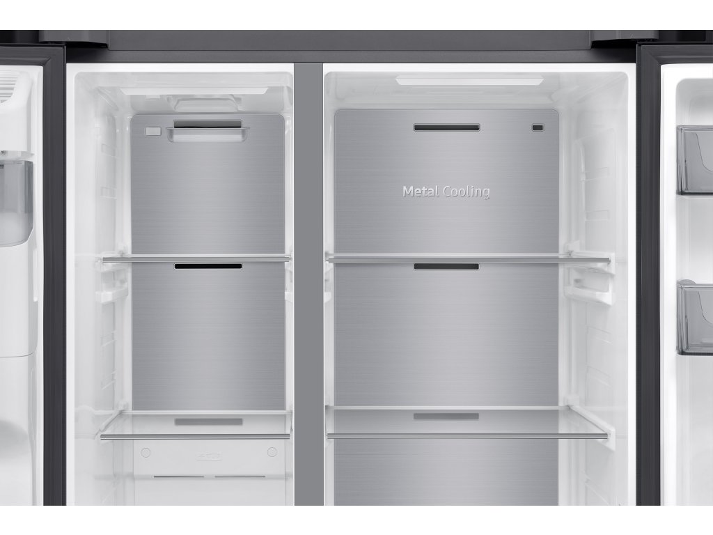 Uvnitř americké lednice Samsung RS70F64KDFEO s výškou 178 cm naleznete i přes její kompaktní rozměry efektivně uzpůsobenou skladovací kapacitu ideální pro početnější rodiny. Chladicí část s čistým objemem 420 l má ve své výbavě 4 police z tvrzeného skla a 2 zásuvky na ovoce a zeleninu. Velkokapacitní box Big Vegi Box nabízí praktický prostor pro uskladnění velkého množství čerstvé zeleniny a ovoce. Kovová deska Metal Cooling integrovaná v zadní stěně zadržuje chlad ze vzduchu a rychle vyrovnává tepelné ztráty. Funkce Power Cool aktivuje intenzivní cirkulaci studeného vzduchu, když třeba potřebujete vychladit velký nákup v letních dnech. Funkce All-around Cooling neustále kontroluje teplotu a zajišťuje rovnoměrnou cirkulaci vzduchu na každé přihrádce.