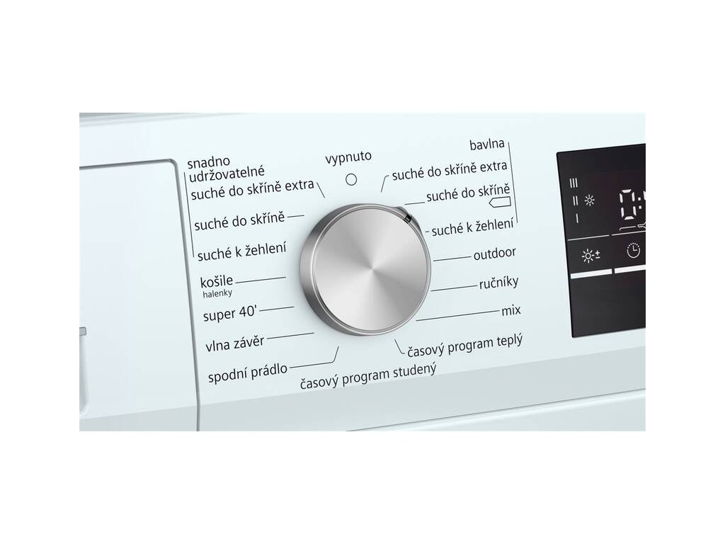 • touchControl tlačítka: ochrana proti zmačkání, délka programu, šetrný, akustický signál, start/reload/pauza, jemné nastavení stupně sušení, nastavení konce sušení až o 24 hod.